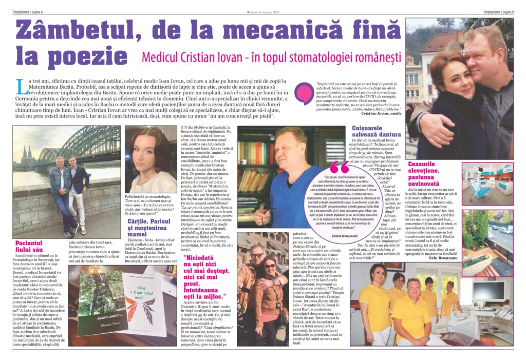 Interviu apărut în Deșteptarea, 6 ianuarie 2023. La trei ani, sfărâma cu dinții ceasul tatălui, celebrul medic Ioan Iovan, cel care a adus pe lume mii și mii de copii la Maternitatea Bacău. Probabil, așa a scăpat repede de dințișorii de lapte și cine știe, poate de aceea a ajuns să revoluționeze implantologia din Bacău. […]